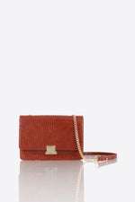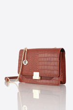 Rectangular in shape, this women's bag is camel in color with a reptile skin effect texture matched with the texture. symmetrically. It has a zipper. flap with gold-colored metal buckle to match the the chain adorning the carrying strap and the brand medallion. The main pocket is divided into several compartments which allow you to easily store your objects