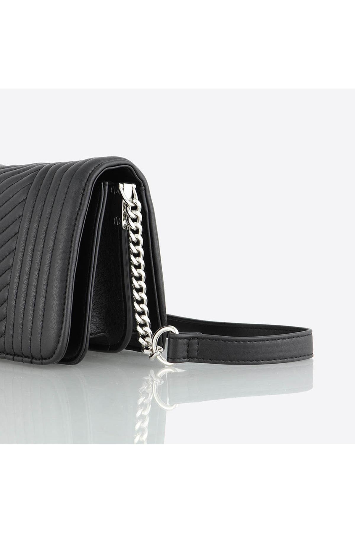 Adjustable chain shoulder strap with a faux leather handle.