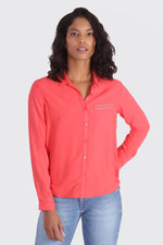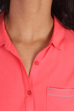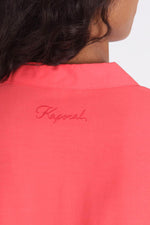 Orange in color, it has a straight cut and a simple button placket. The small chest pocket is embellished with two rows of diamond-look pearls. The Kaporal brand is embroidered on the back, just below the collar.