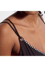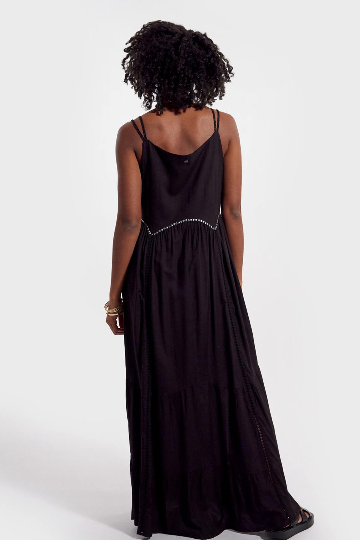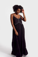 Its thin braided straps are chic in their metal loops. They give birth to a neckline plunging. The decorative pattern sewn on the bust gives the impression of wearing a corset which sets the tone for your look. a large, flowing skirt.