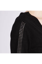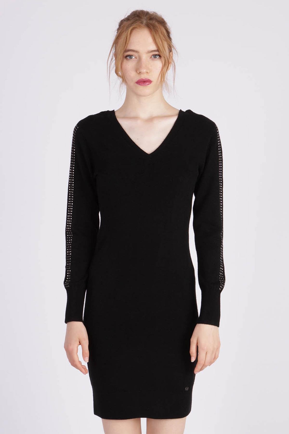Featuring long sweatshirt-style ribbed sleeves, this dress has a scooped-forward neckline and in the back. The outer side of the sleeves is decorated with by a length of rhinestones which gives a This dress is a proven class. The base is also ribbed and plated with the brand's metallic logo.