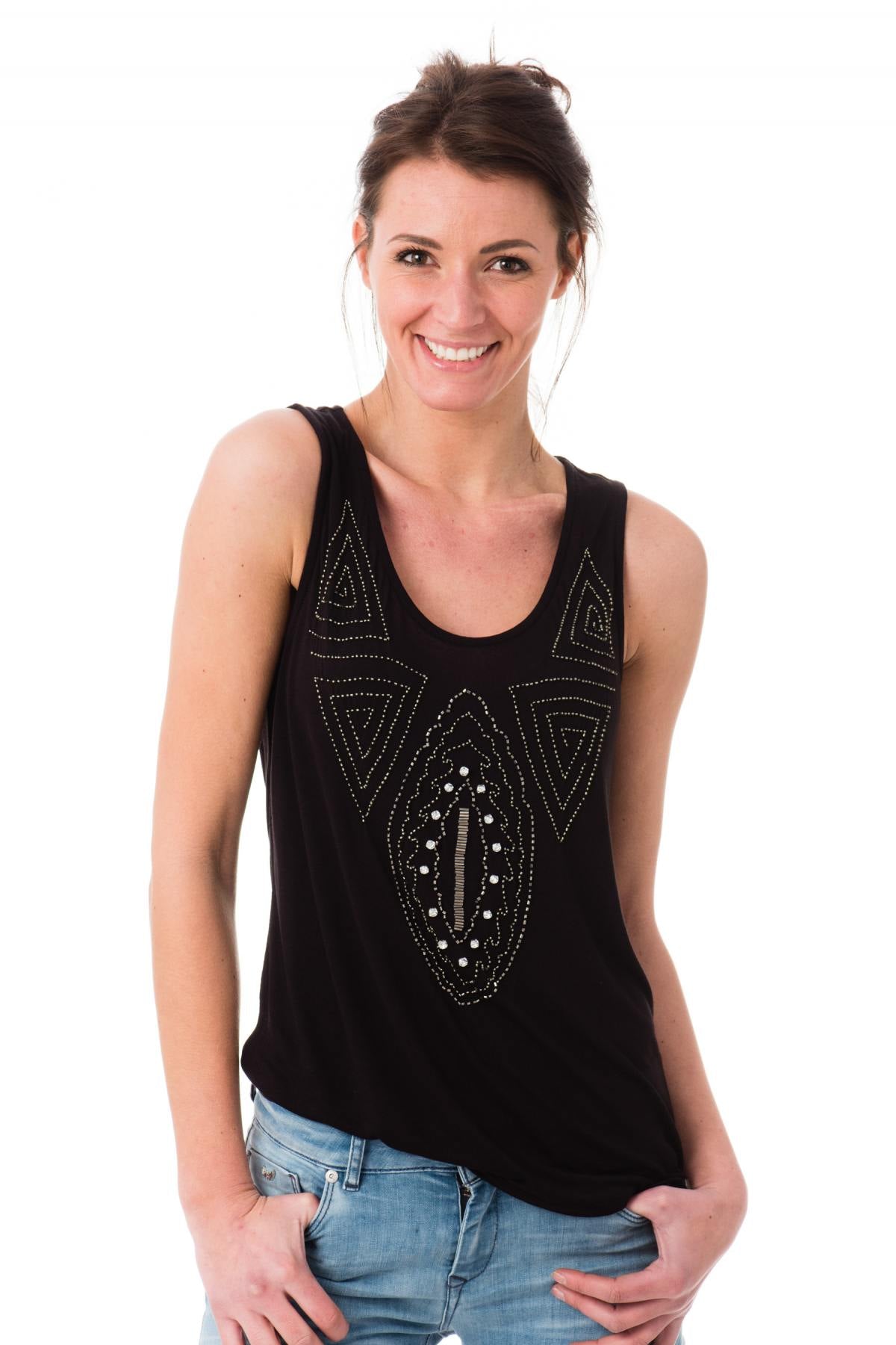The FONKY BLACK P17 tank top is a very fashionable model with magnificent pearl ornaments on the front.