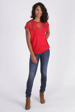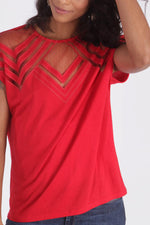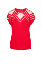 This red t-shirt has short sleeves and a round neck. The neckline is embellished with floral print. the front by  geometric shapes on veil that allows a glimpse of your skin, for a sensual result. The brand logo is flocked. at the neck.