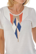 This round-neck t-shirt with its magnificent pink embroidery , blue, white and gold will perfectly complete your outfit.
