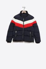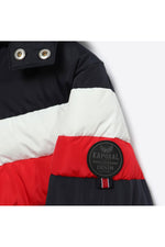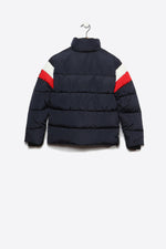 The BAROY NAVY is a navy blue children's down jacket with edging. white and red on the front.