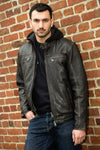 A hooded leather jacket for men, the PHILADELPHIA RUB OFF BLACK by Cityzen embodies urban spirit with a sleek and assertive style. A confident look blending comfort and modernity.