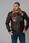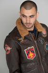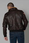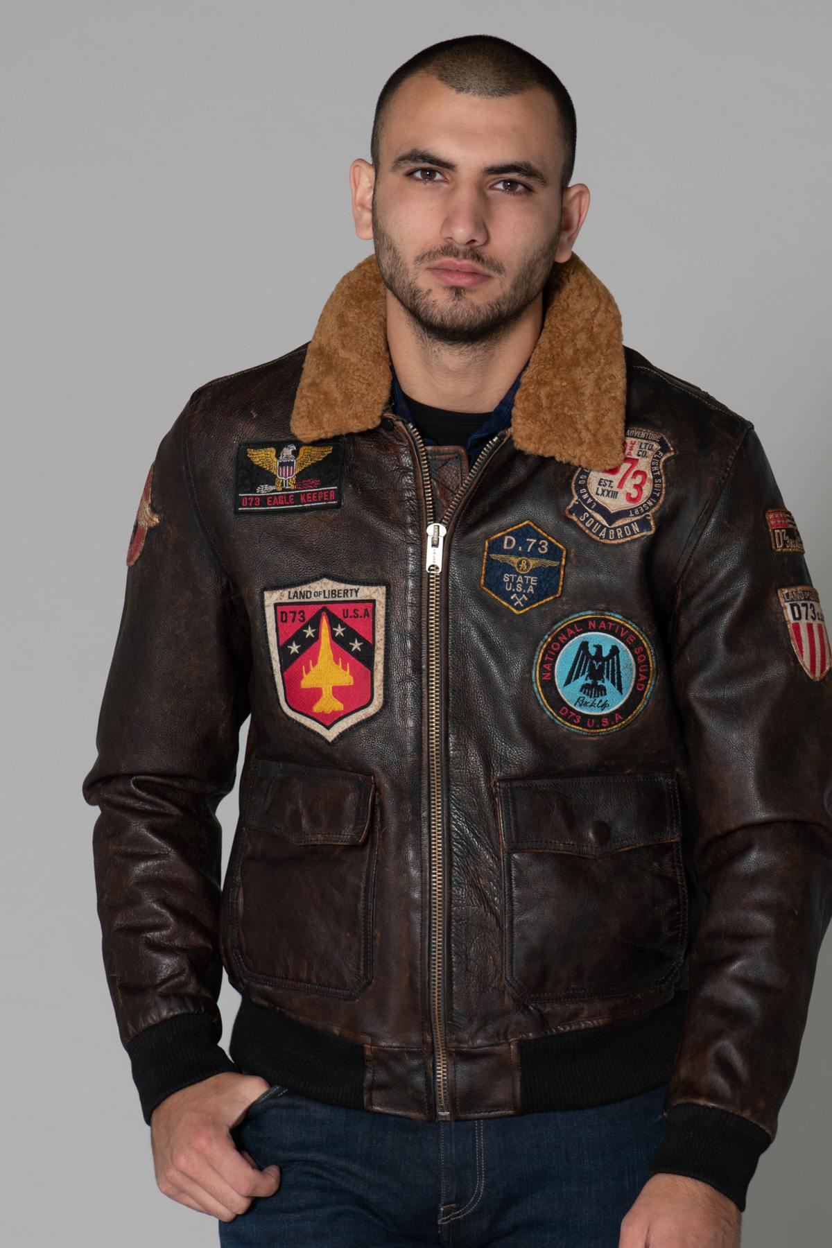 Its cowhide leather catches the eye, with a worked construction and an aged effect with careful details. to the nearest millimeter. It benefits from a removable genuine sheepskin leather collar, as well as the ribbed edges present at the front. waist and wrists. The stitching is neat and robust. They are accompanied by decorative patches that recall the world of the Top Gun film. We also find a resistant and centered zipper, and on either side of it, 2 pockets with zippers. Snap flaps above the waist. À Inside, 3 pockets (zip, snap and phone) will ensure security. of your personal belongings.
