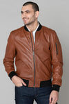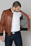 Bomber jacket in cognac leather and black ribbed edge - Image n°1