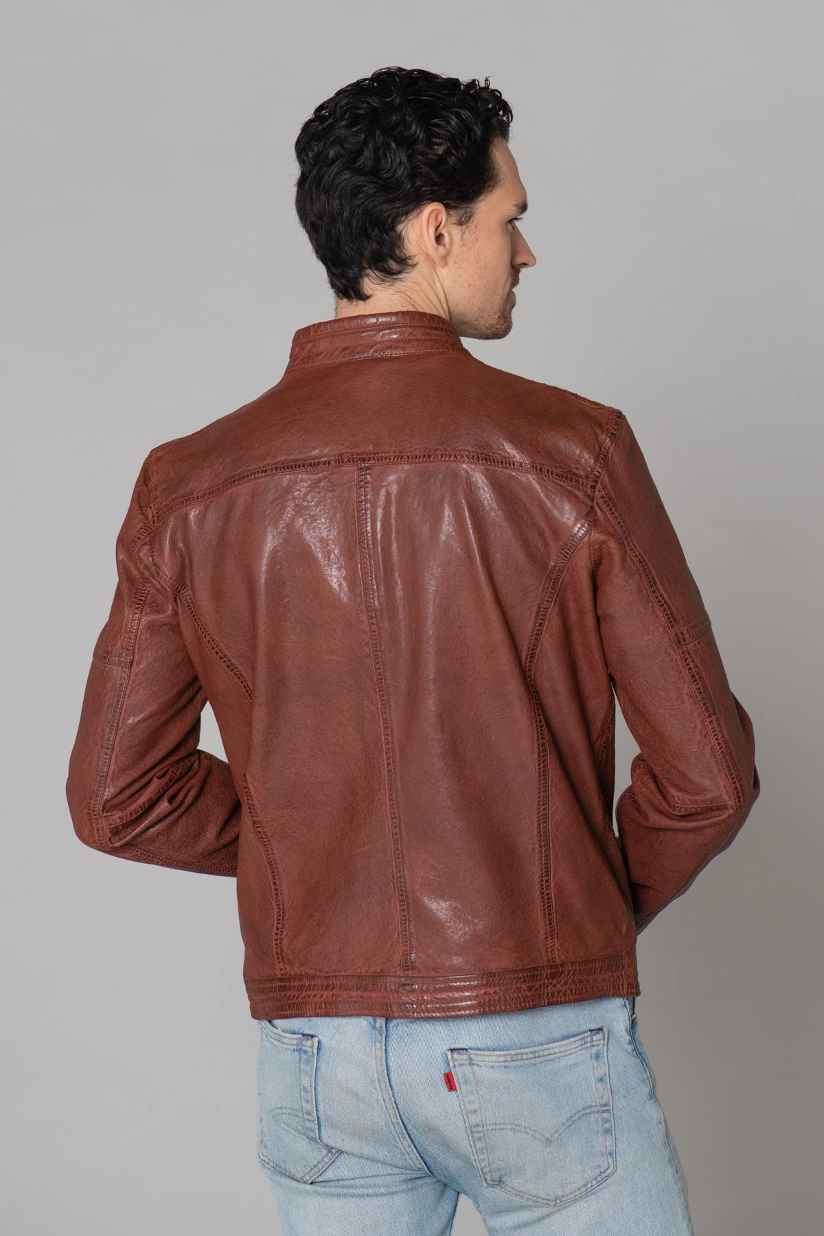 You have to dare, and the brown color of this GBCLANCY LABUV DARK COGNAC men's jacket from the GIPSY label gives you this possibility. Designed to Made from vegetable lambskin, this biker collar has a regular cut.