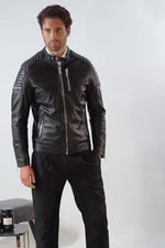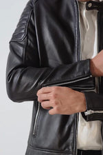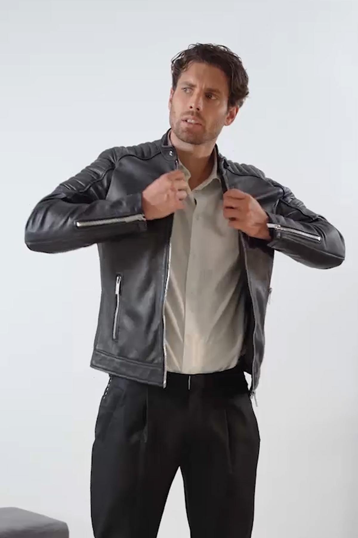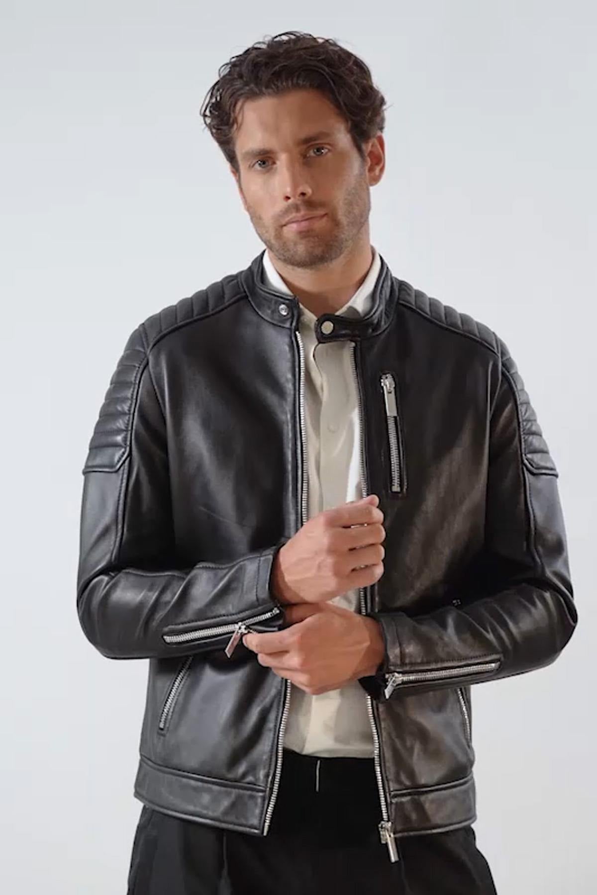 The jacket has a classic biker collar, with a snap button for adjustment . The chest pocket and side pockets are zipped, as are the central closure and the gussets at the cuffs. We love the topstitched quilted inserts on the shoulders which add an undeniable edge and offer the ideal masculine build. The softness and lightness of leather makes you appreciate all the quality superior quality of this irresistible piece.