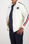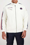 The Steve McQueen JACKET MCQUEEN JAM01-002 HEATHER ECRU jacket stands out for its refined details and high-quality design. Made from polyester, this white jacket features a full-length zipper, a round snap collar, as well as elastic ribbed edges at the waist and sleeves for optimal comfort. It has three exterior pockets, including one zipped on the chest, and an interior pocket for more practicality. The embroidered “Le Mans” and “Steve McQueen” logos add an authentic touch, while the blue, white and red tricolor stripes on the shoulders and sleeves underline its dynamic and sporty character.