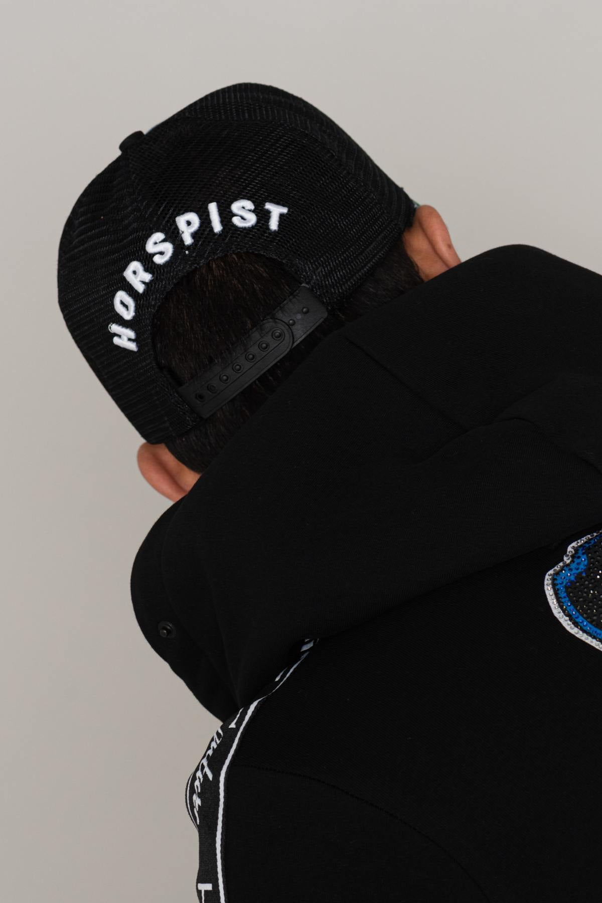 Brand badge on the print, curved visor with embroidered wings and Horspist logo on the edge.