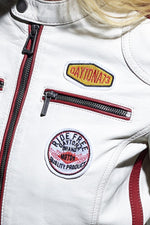 The red and black edging sewn along the length of the sleeves, on the sides, the zipped pockets and the axial metal zip, contrast with the style. wonderful with the white color of the central part. And the numerous patches placed on the sleeves and chest accentuate the side. cool look of this biker jacket with with a buttoned strap at the collar and metal zips at the ends of the sleeves. The ribbed band sewn on the waist ensures a good fit and highlights your silhouette.