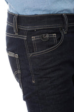 5 pockets including 1 ticket pocket and 1 back pocket. re with brand badge.