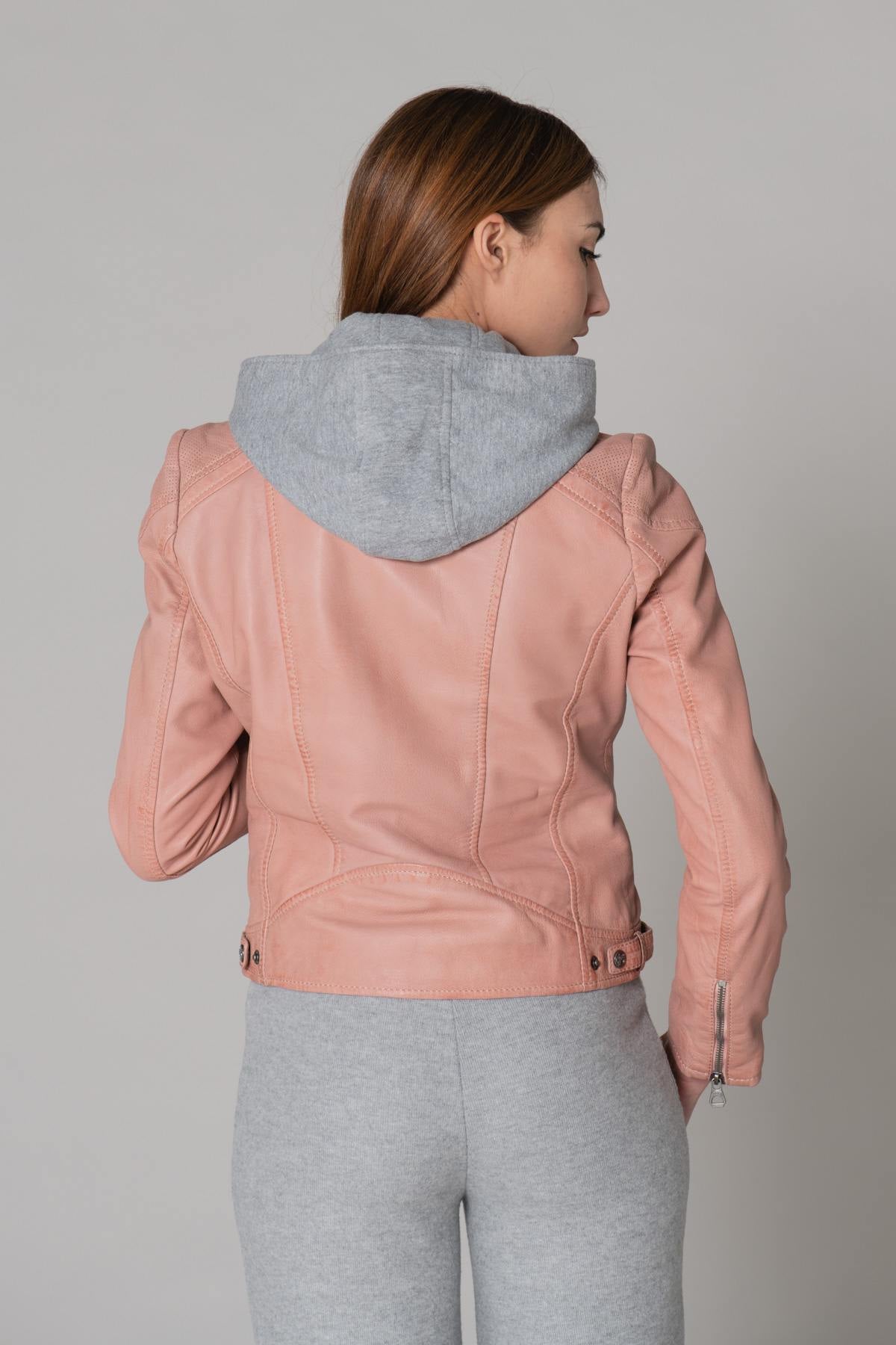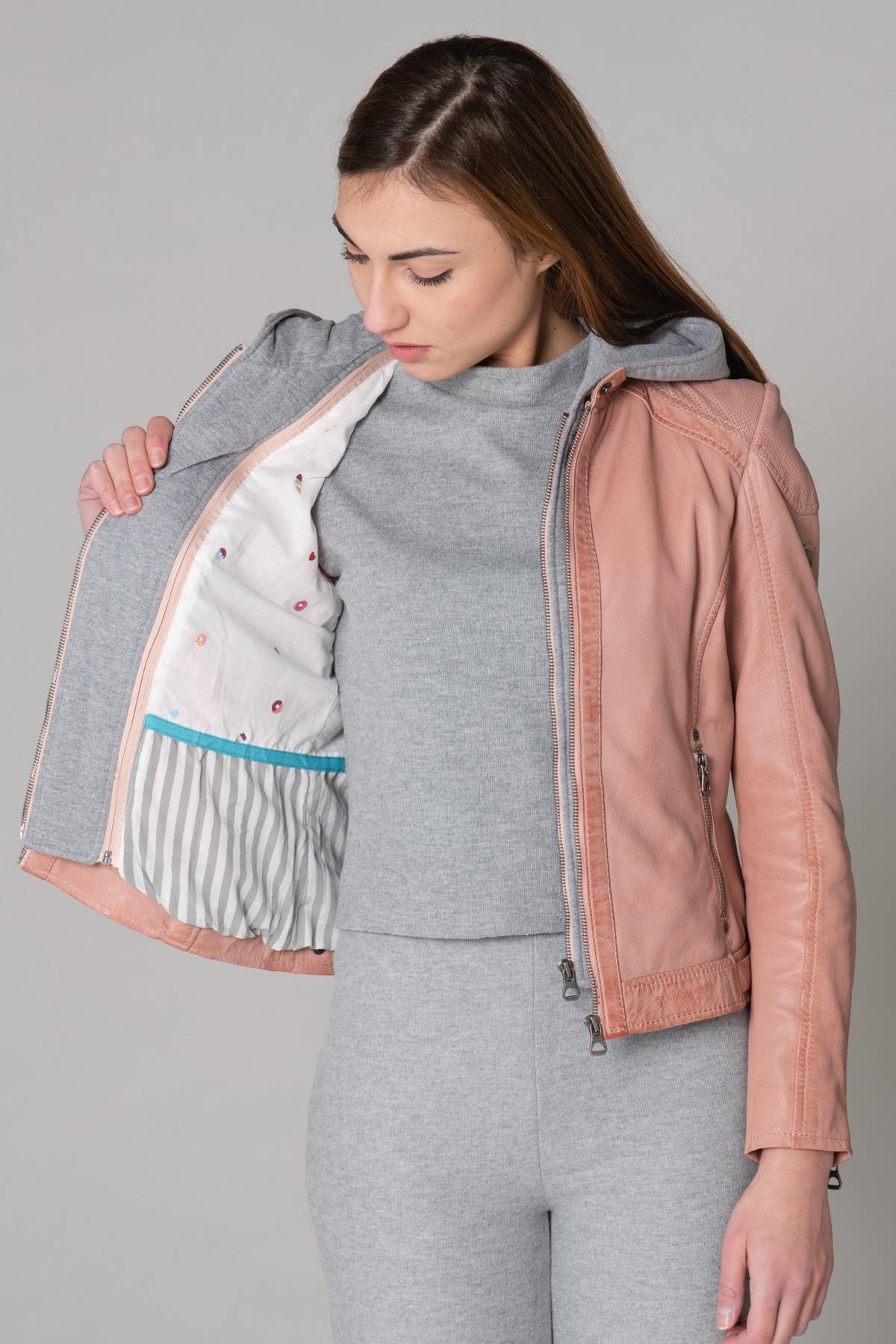 Here, the brand pulls out all the stops to seduce us, first of all with the pastel pink color which instantly brings a touch of originality to your look. and freedom. The contrasting cotton hood is easily detachable. The collar is biker type and closes with pressure. Numerous tanned zips energize this model. We find a central zipper, slanted zippered pockets at the back. the base, or even comfort zips at the cuffs. Decorative snaps are seen on the shoulders, while snap tabs allow you to adjust the size. Beautiful topstitching the waist and along the central closure reinforce the patina effect. leather. Finally, the inserts printed with floral patterns. polka dots and the pretty light lining demonstrate that nothing is left untouched. randomly in this model.