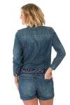 The KARM FREEZ is a superb denim playsuit embellished with leather. embroidery on the chest and on the bottom of the shorts.