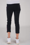 The jeans feature ultra-feminine cropped legs in a very designer innovative style. It closes at with the help of a button and a zip fly. The dark blue stretch fabric follows the morphology and structures a silhouette full of charm and character. There are 4 pockets in this model, including 2 pockets on the front and 2 others on the back. Very chic side braids in blue, red and silver run the length of the legs.