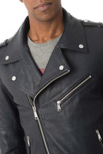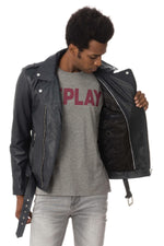 The ROCKY DARK NAVY is a sheepskin leather perfecto with a semi-thick lining, perfect for mid-season.