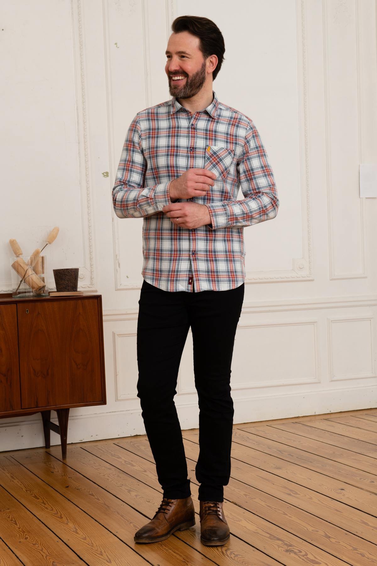 With a shirt collar, it closes with a single button placket on which round buttons are sewn navy blue to match the orange and navy blue color of its pattern tiles. A pocket is placed on the side. left chest and is decorated with the brand logo in orange embroidery.