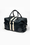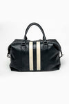 This travel bag is made from premium sheepskin leather, offering durability and elegance with its very dark blue color and distinctive white stripe down the center. The collaboration with Jacky Ickx is highlighted by a signature on the front logo, adding a touch of authenticity and prestige. The bag is equipped with a front snap pocket, a flat zippered pocket for quick access, and a secure zipper. The removable shoulder strap and large handles offer various carrying options. The interior is dressed in iconic checked fabric, ensuring interior style is as captivating as the exterior. Available in two sizes, this model has a length of 54 cm, a height of 47 cm, and a width of 24 cm.