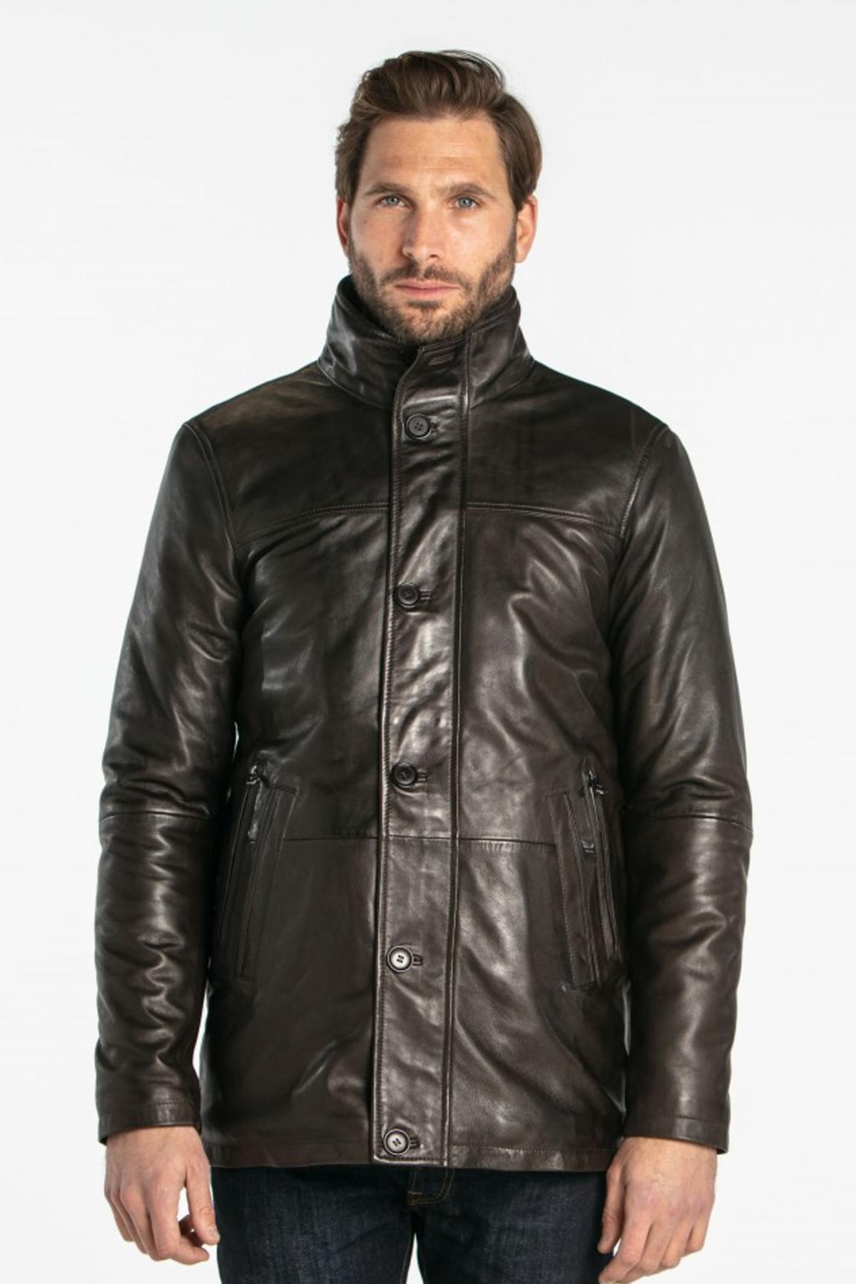 The surface makes you appreciate a skin machined with the greatest care. The patina and the crinkled effect are irresistible. The model has a detachable fleece facing and a removable cotton lining. The collar is high and closes thanks to the collar. 2 buttons. The central closure has a zip and a buttoned tab that runs along the entire length of the garment. The reference label innovates with here a system with 4 side pockets, including 2 zipped.