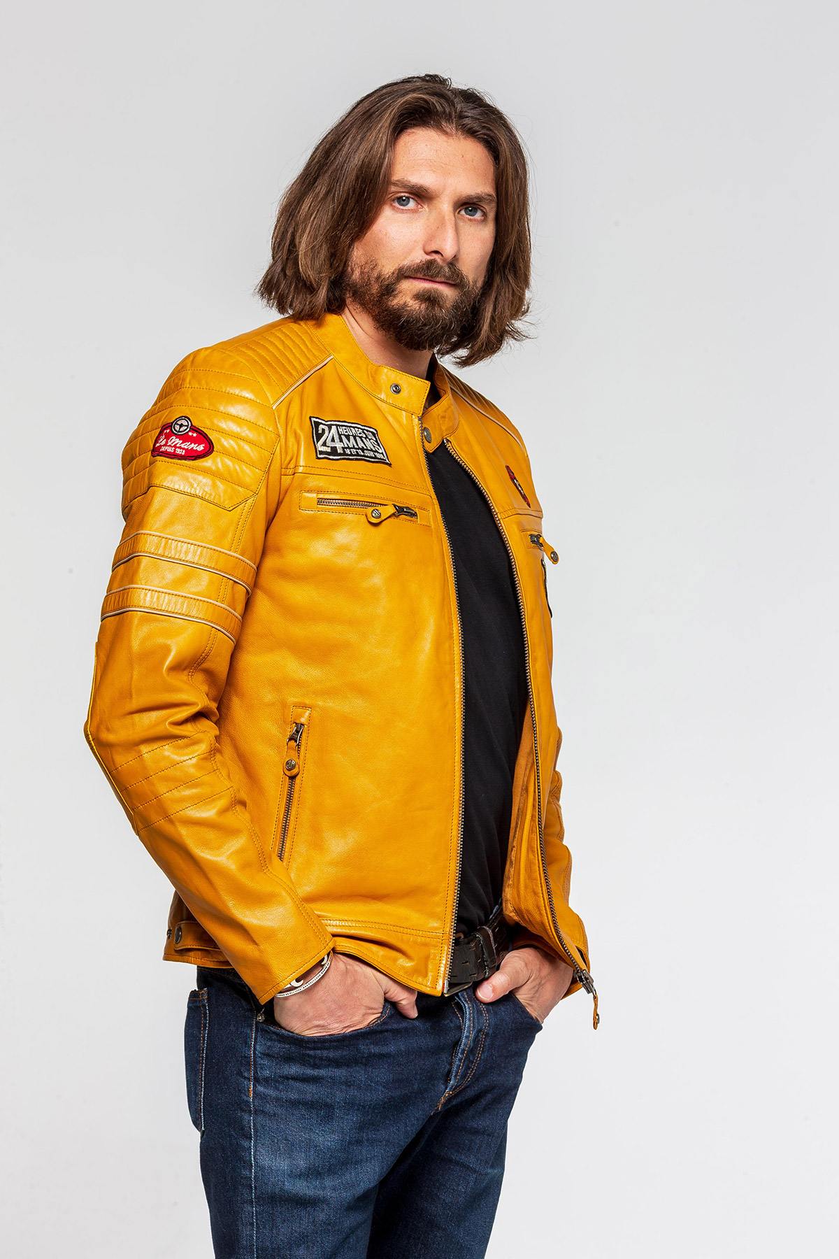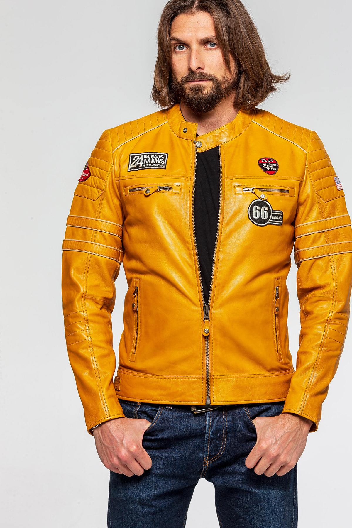 Biker collar jacket in homage to the Le Mans 66 race. the Ferrari 275 GTB/C which competed in this famous competition . The patches sewn on the leather come from the official logos used during these 24 hours.