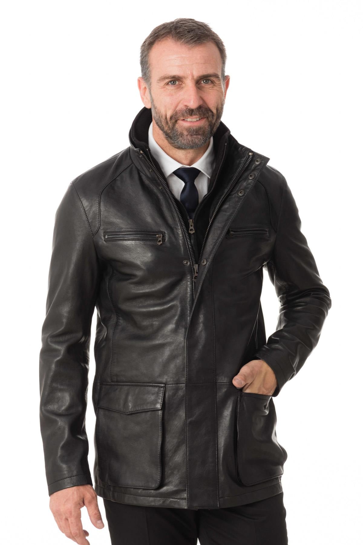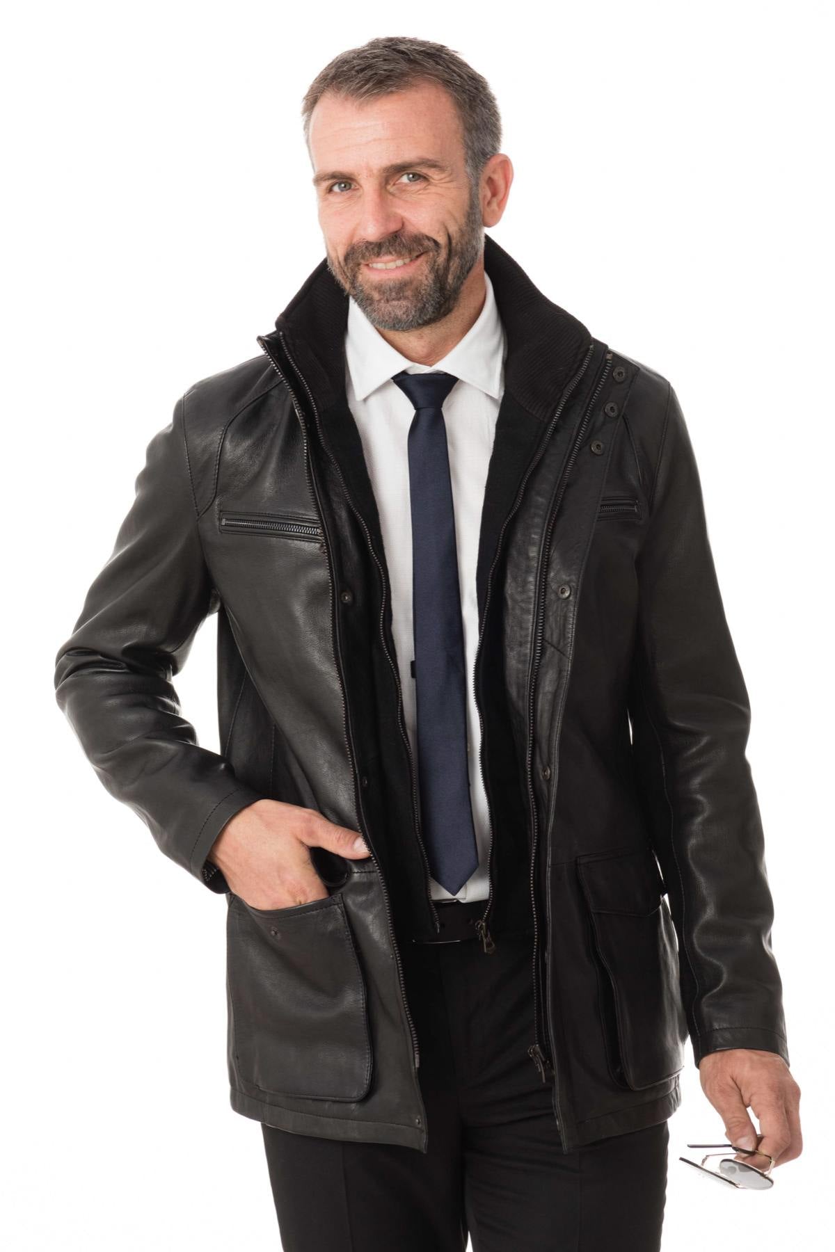 Lamb leather and cotton and polyester lining, very flexible, you can wear it very easily over a suit.