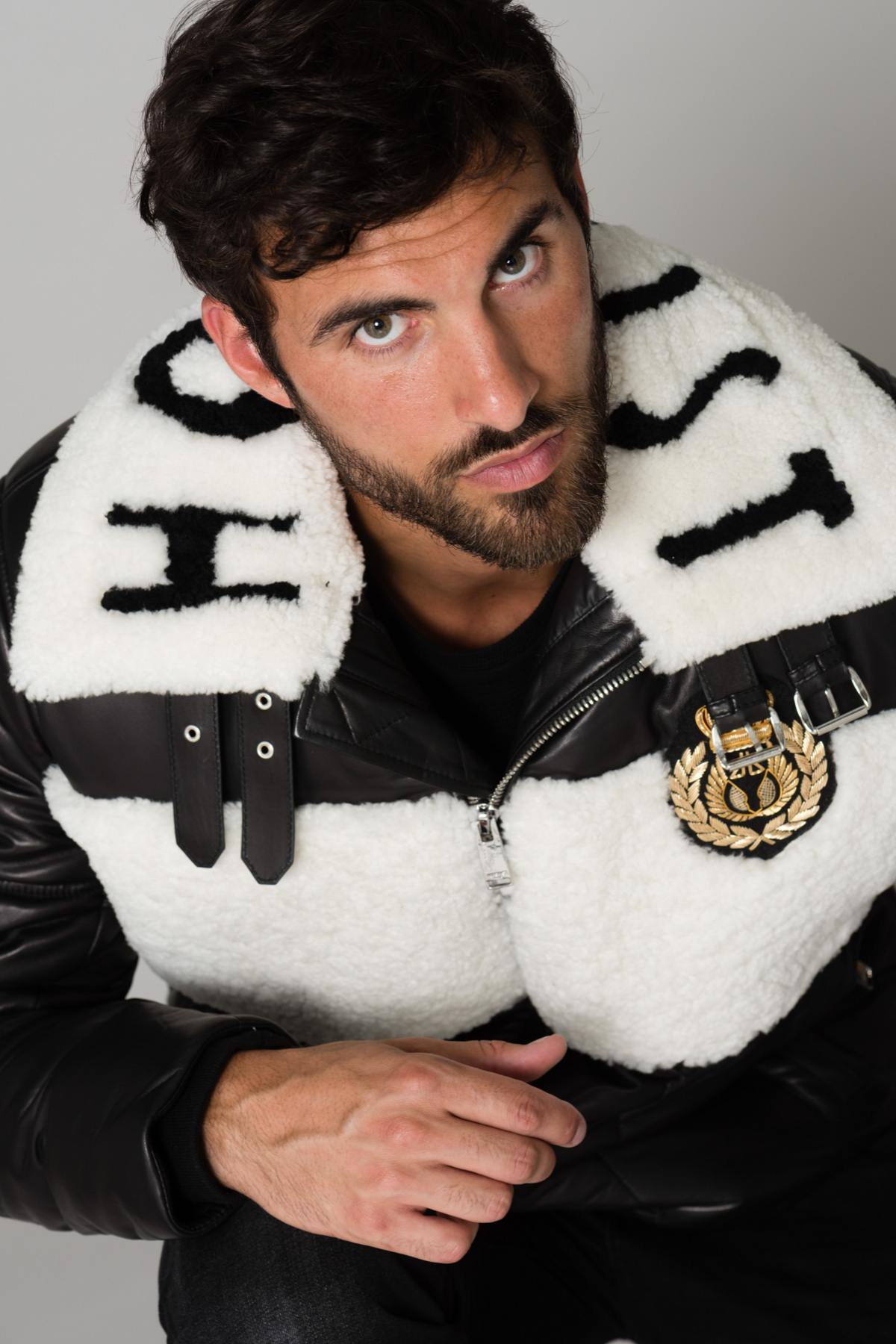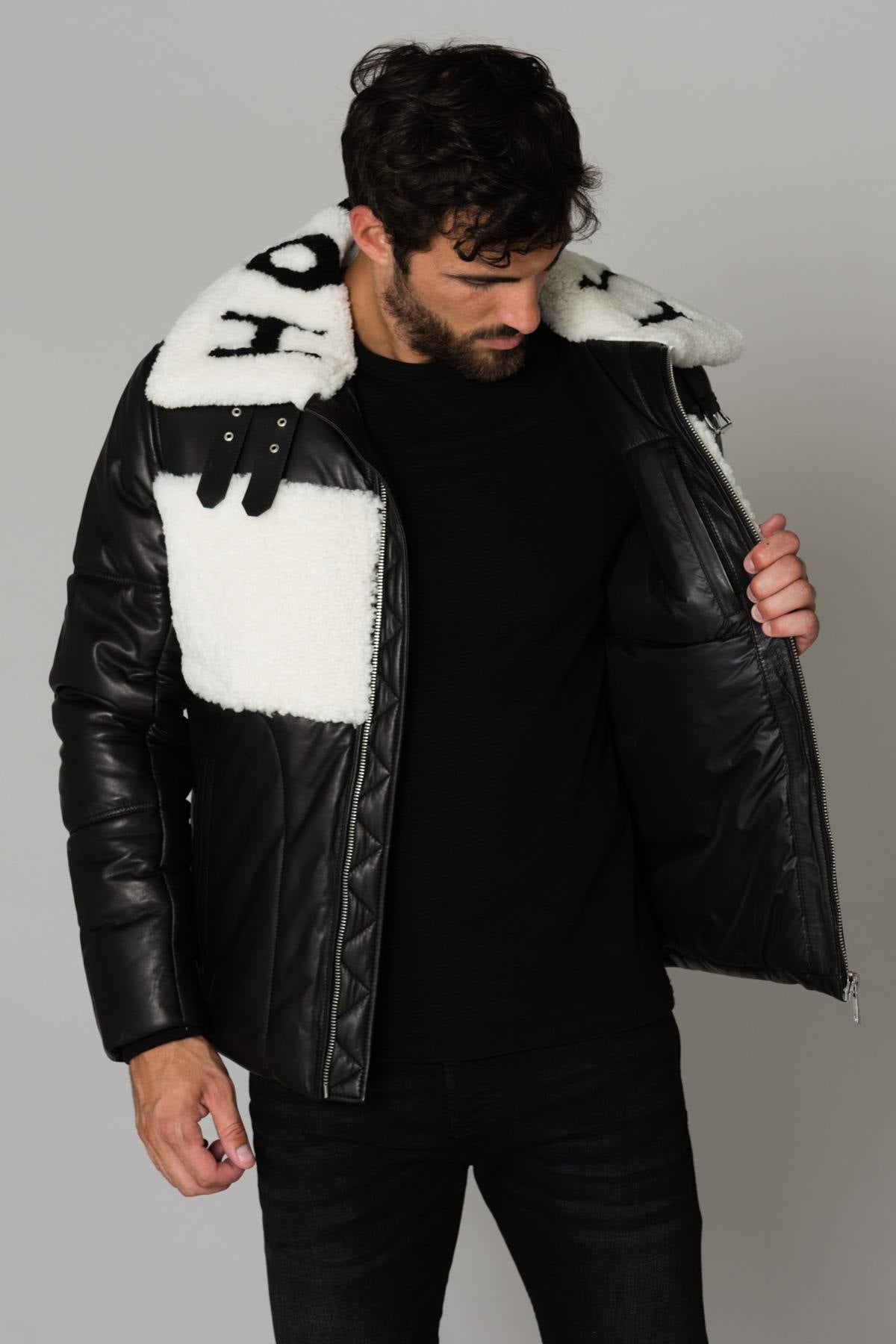In lambskin leather with a band of sheepskin fur on the chest with badge.