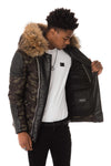Its fixed hood is adorned with real natural fur, removable with snaps.