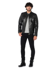 This black sheepskin leather jacket with A polyester lining has a very fashionable biker style, particularly thanks to the seams on the sleeves as well as on each side of the jacket. from the waist.
