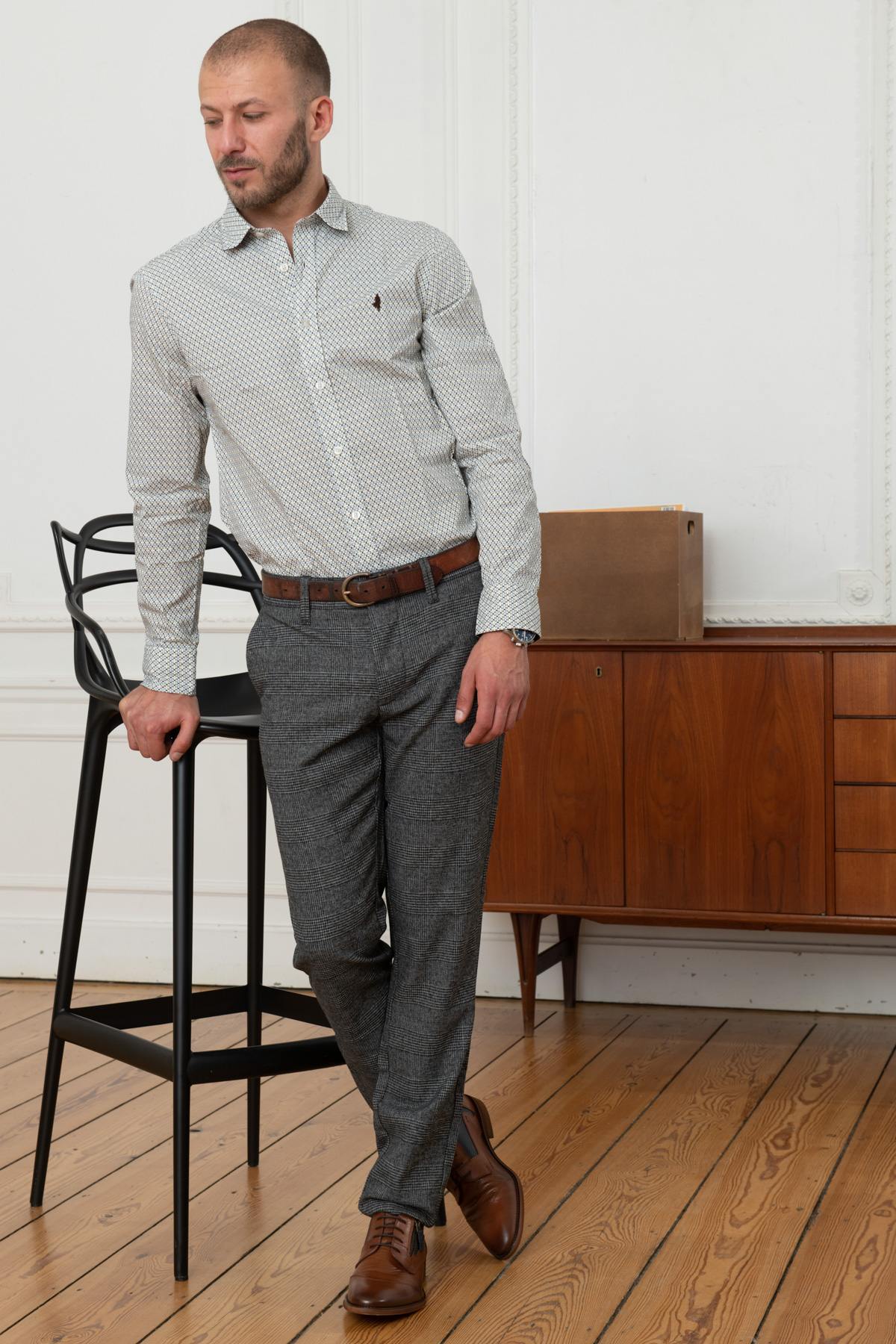 This shirt is classy and very chic. The numerous flocked patterns on its white surface give it a unique beauty. unique. The low-cut collar gives birth to a single button placket with white buttons similar to the those used in the long sleeve closure system. The brand logo is embroidered. in brown on the side left chest.