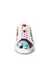 The shoe has a white semi-compensated sole for an ultra comfortable heel. It has flat white lacing, crossing 7 pairs of fine and discreet eyelets. An exceptional color scheme makes this model irresistible. We find super fun power game patterns, as well as a plain red tongue that perfectly matches the style. the multi-colored stem. The interior is entirely white, while the yellow buttress bears the inimitable logo of the French brand. The white outsole has a relief engraving of the Horspist brand.