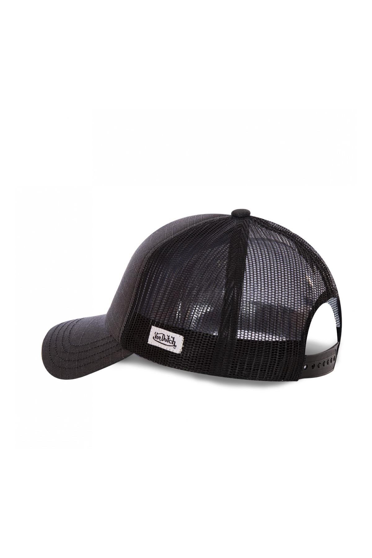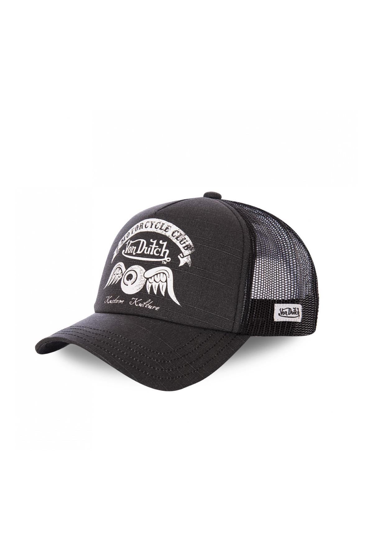 The black side is flocked. with a winged eye à the Kustom Kulture way. The brand name is printed on the label. just above. The visor is curved, while the mesh shell is plated with a brand label on its side. LEFT. An adjustment system is present there. at the back to adjust the head circumference to the correct size. your comfort.