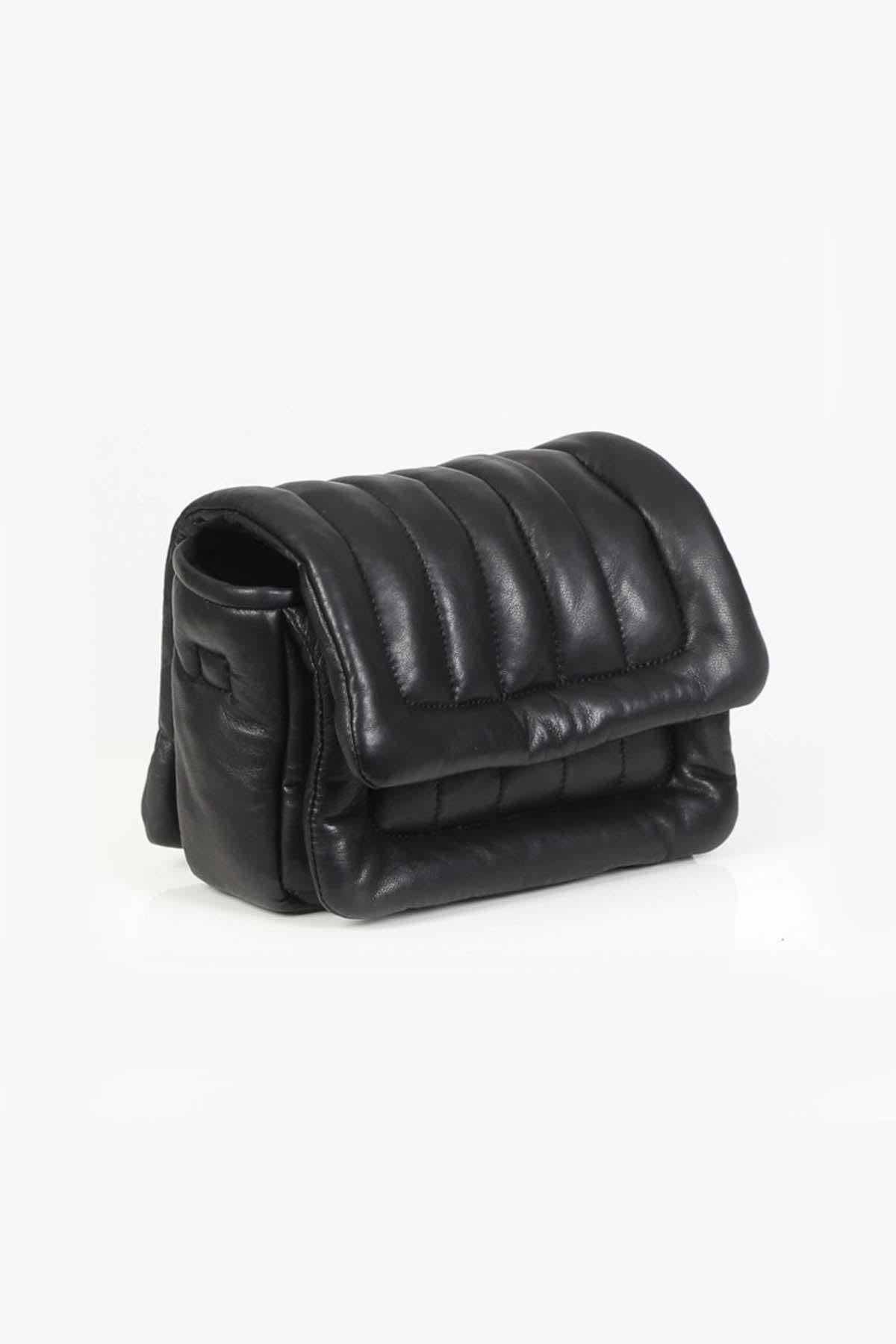 Sober, elegant and trendy, this bag, in the format L 22 cm x D 7.5 cm x H 15 cm, is in sheep leather.
