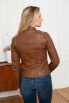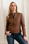 Its cognac-colored sheepskin leather construction will offer you softness and finesse. It comes with a fitted cut full of character, which highlights femininity. in the foreground. The biker style is reinforced by a mandarin collar with metal snap at the front. worn effect. The latter comes down to a central closure whose zip matches those of the slanted hand pockets on the sides. We like the neat seams and the piped topstitching which gives structure to the middle. front and back. The size as to It has legs equipped with metal buckles at the back. barb. The black contrast lining includes a cognac-colored zipped pocket.