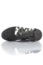 Nahkapohjallinen ja valkoinen elastomeerinen ulkopohja painatuksella. harmaa naamiointi.