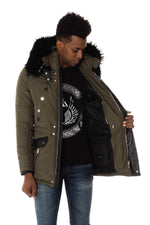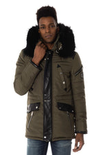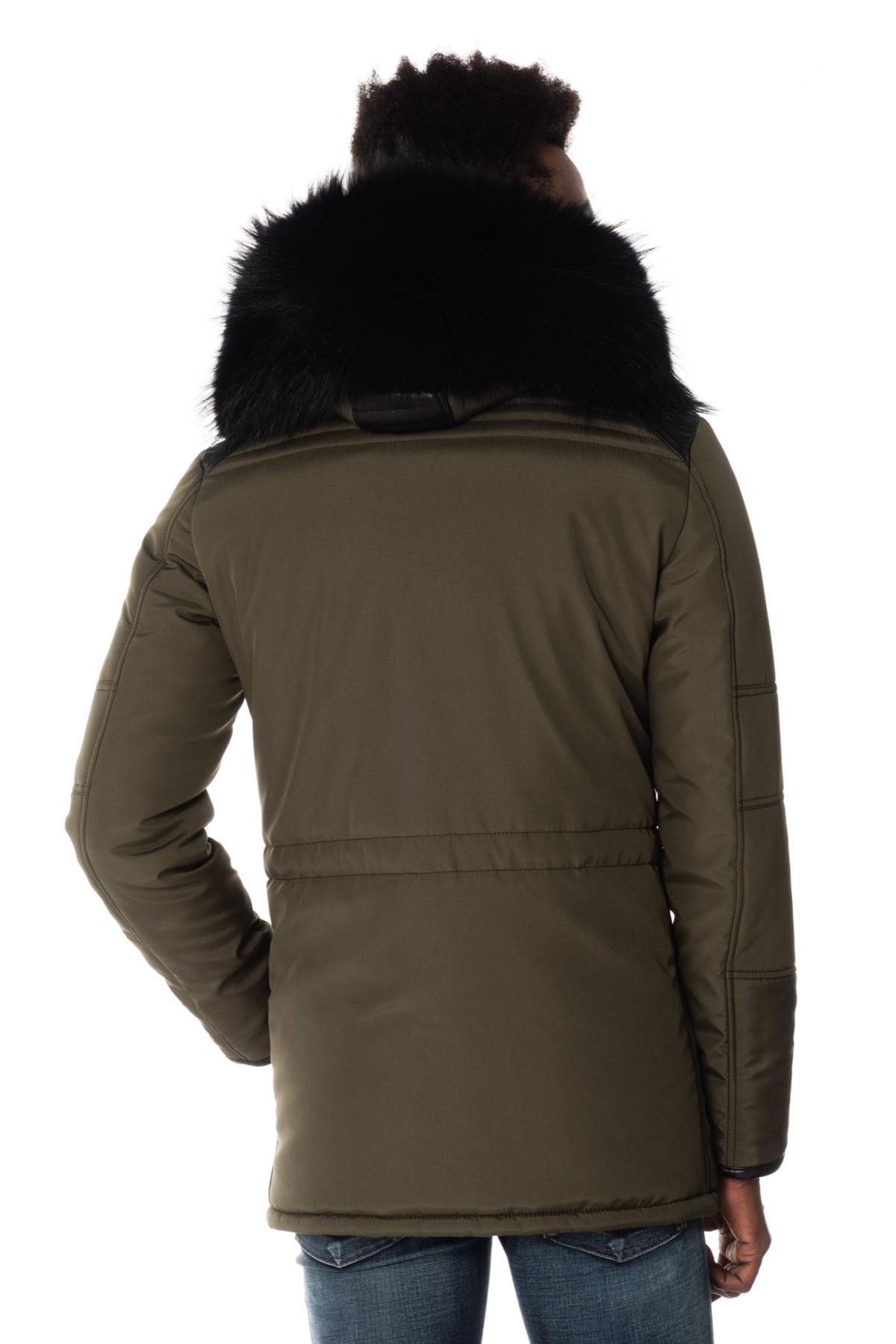 Korkea kaulus, jossa hihnat kiinteällä hupulla ja irrotettava turkki painonapeilla (nahkahihna nappien piilottamiseksi).