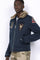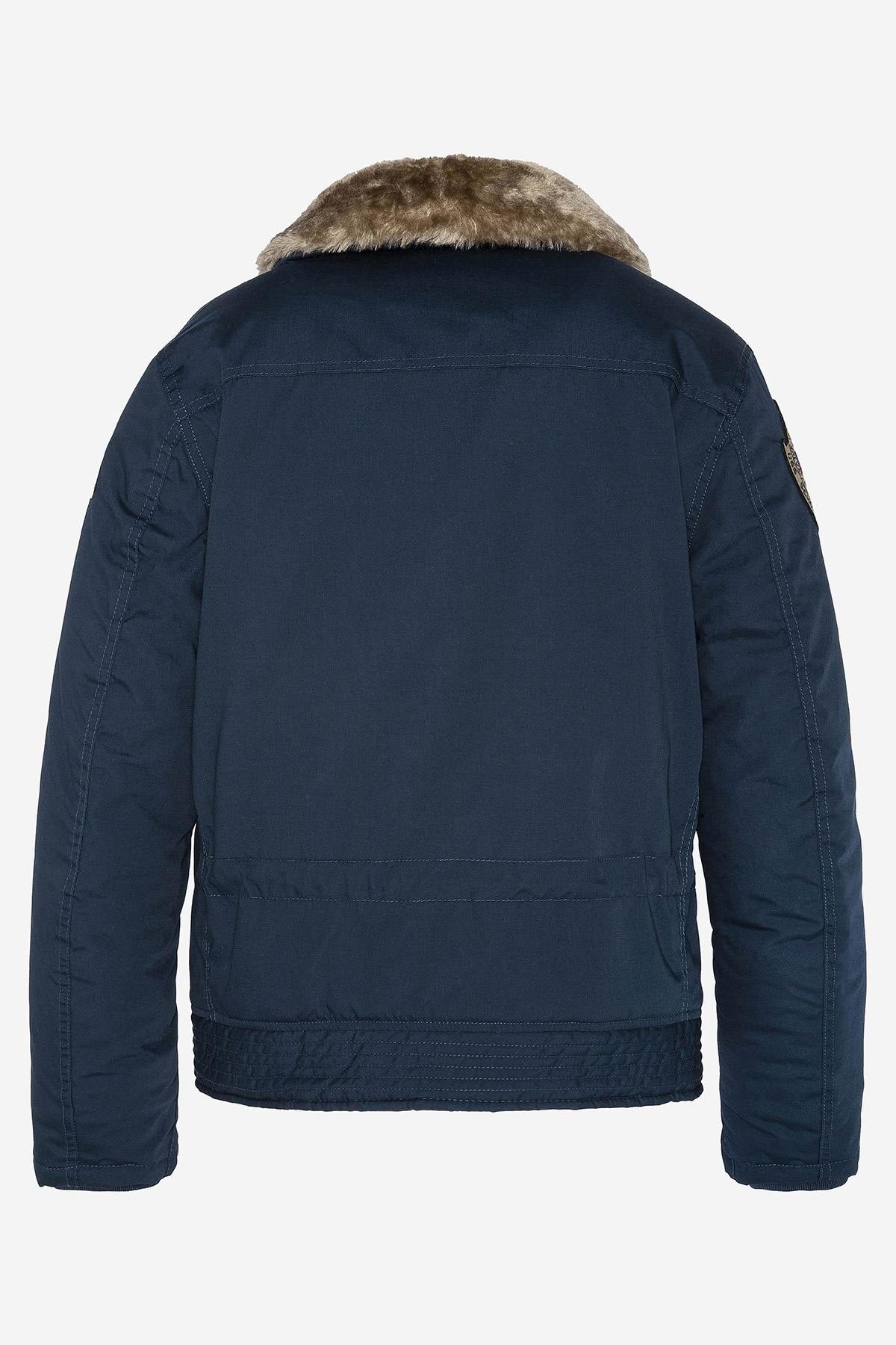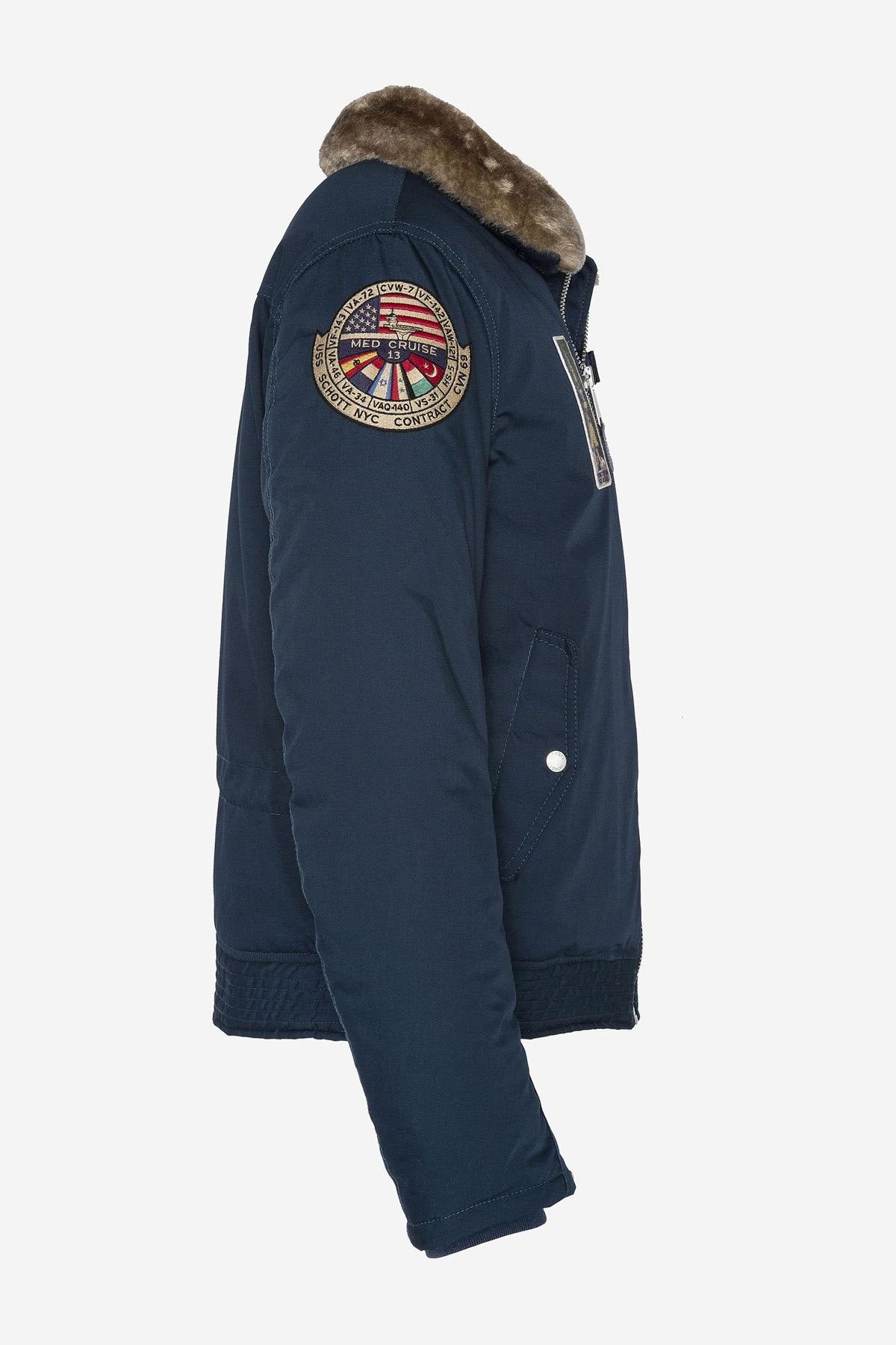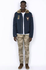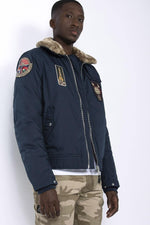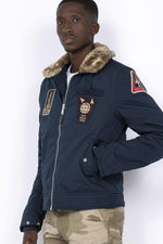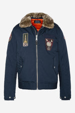 Tämä laivastonsininen takki suljetaan akselia pitkin pitkällä metallivetoketjulla, ja se on koristeltu vetoketjulla. lukuisilla laastareilla aiheesta ilmailu ja USA:n liitto liittolaismaidensa kanssa. Tämän takin paidan kaulukseen ommeltu turkis antaa sille erittäin tyylikkään ja omaperäisen tyylin. Kaksi sivutaskua ovat napilliset ja noudattavat omaperäisyyttä, kuten myös pitkien hihojen päät.