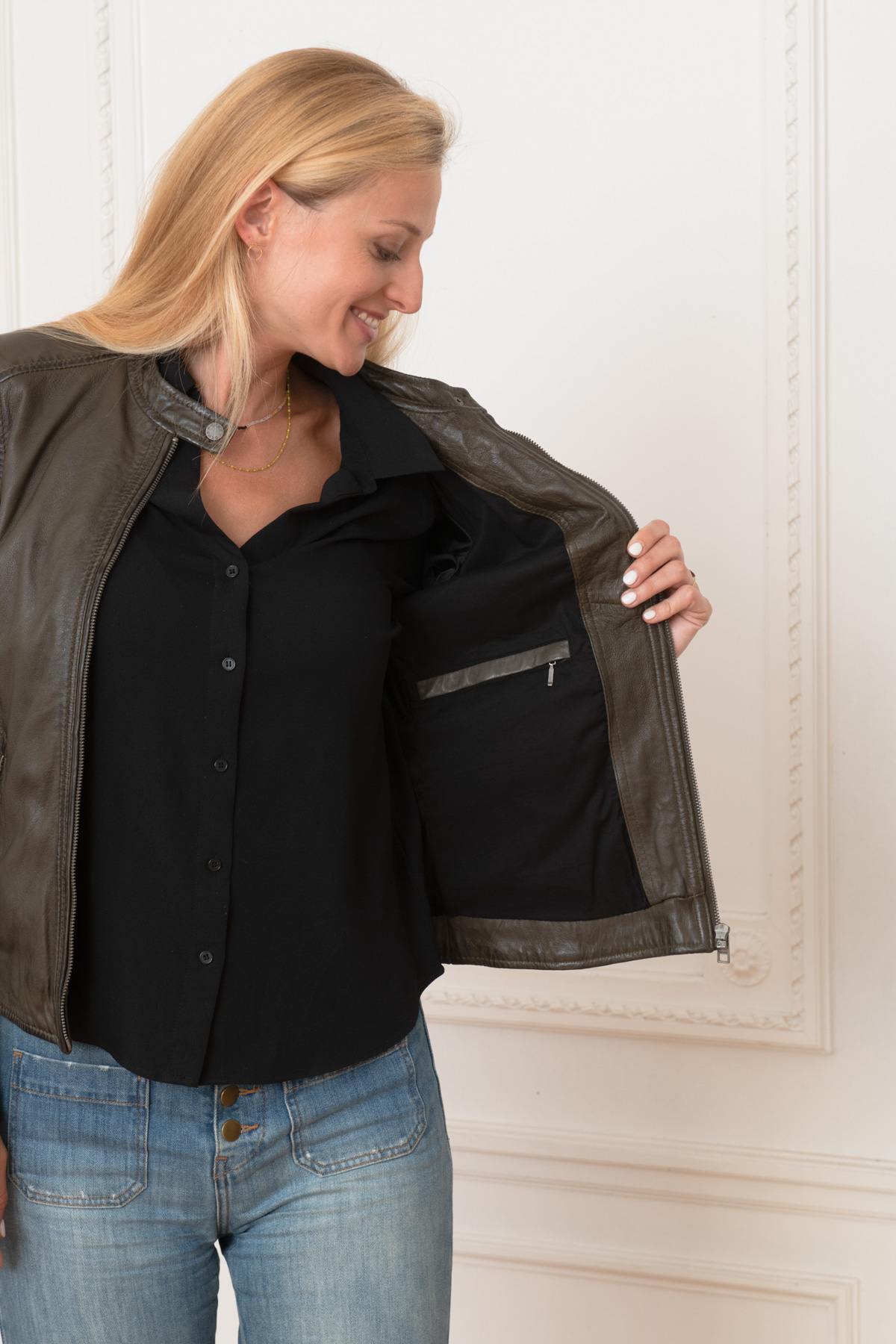 OAKWOOD-brändi esittelee sinulle uudistetun pyöräilijän kauluksen. tämän KARINE BRONZE 585 naisten takin kanssa. lammasnahkainen ja saatavilla tavallisella leikkauksella.