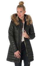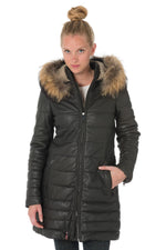 Kiinteä huppu, koristeltu upealla pesukarhun turkilla, irrotettava painonapeilla.