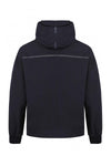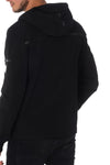 Tässä mallissa on useita taskuja: yksi rinnassa, kengurutasku edessä läpällä; paine, yksi tasku vasemmassa hihassa ja yksi näkymättömällä vetoketjulla oikeassa kyynärvarressa. mustaa nahkaa takana.