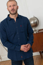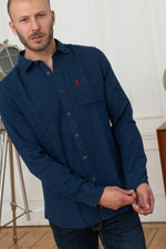 Sen laivastonsininen väri korostaa täydellisesti sille annettua farkkuvaikutelmaa. à sen pintaan. Se tuntuu todella farkkupaidalta. Paidan kaulus synnyttää; yksi nappilista, jota koristaa punainen merkkitarra. Laukun sivulla on pieni tasku. vasen rintakehä ja siihen on brodeerattu tuotemerkin logo. yläosa punaisena.