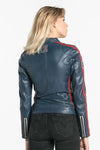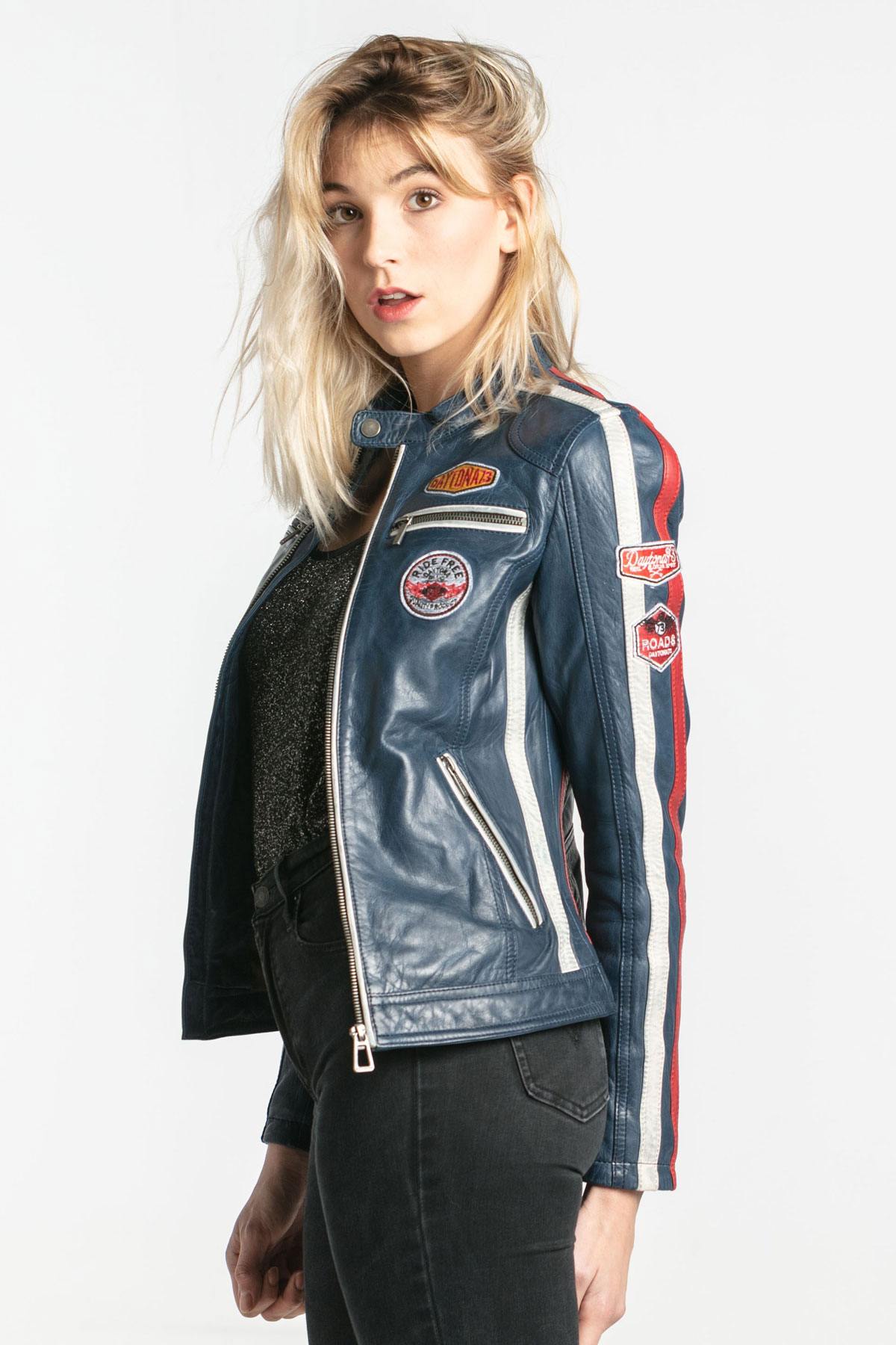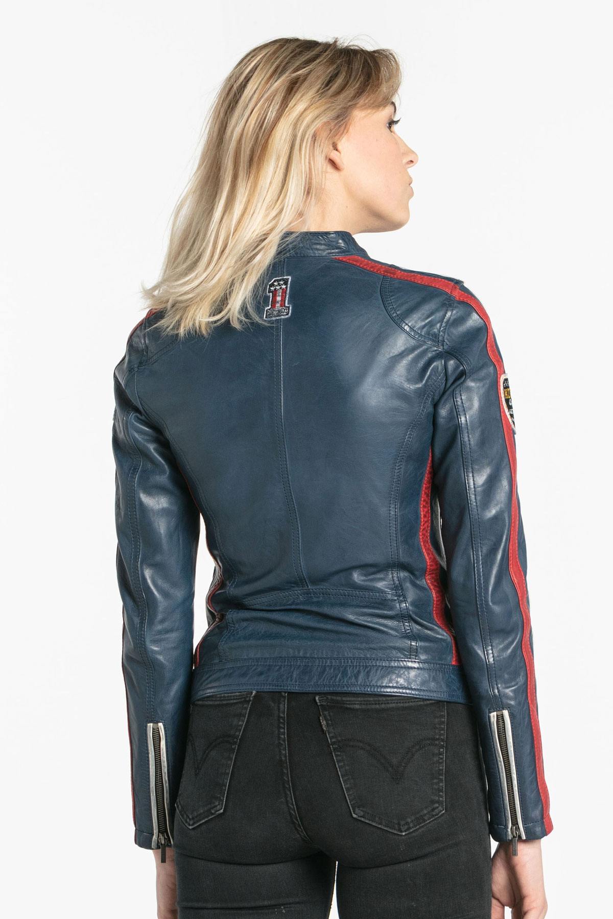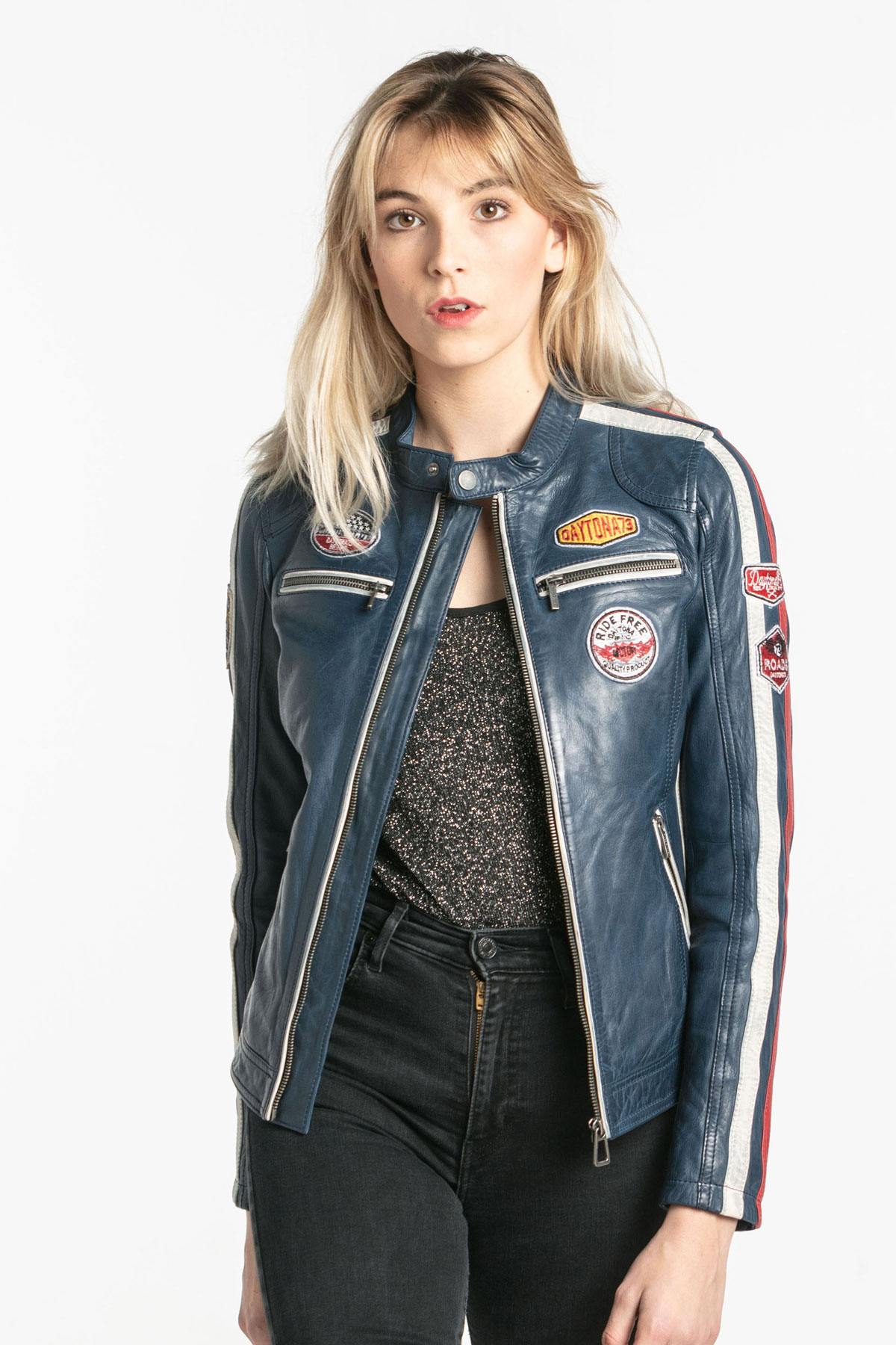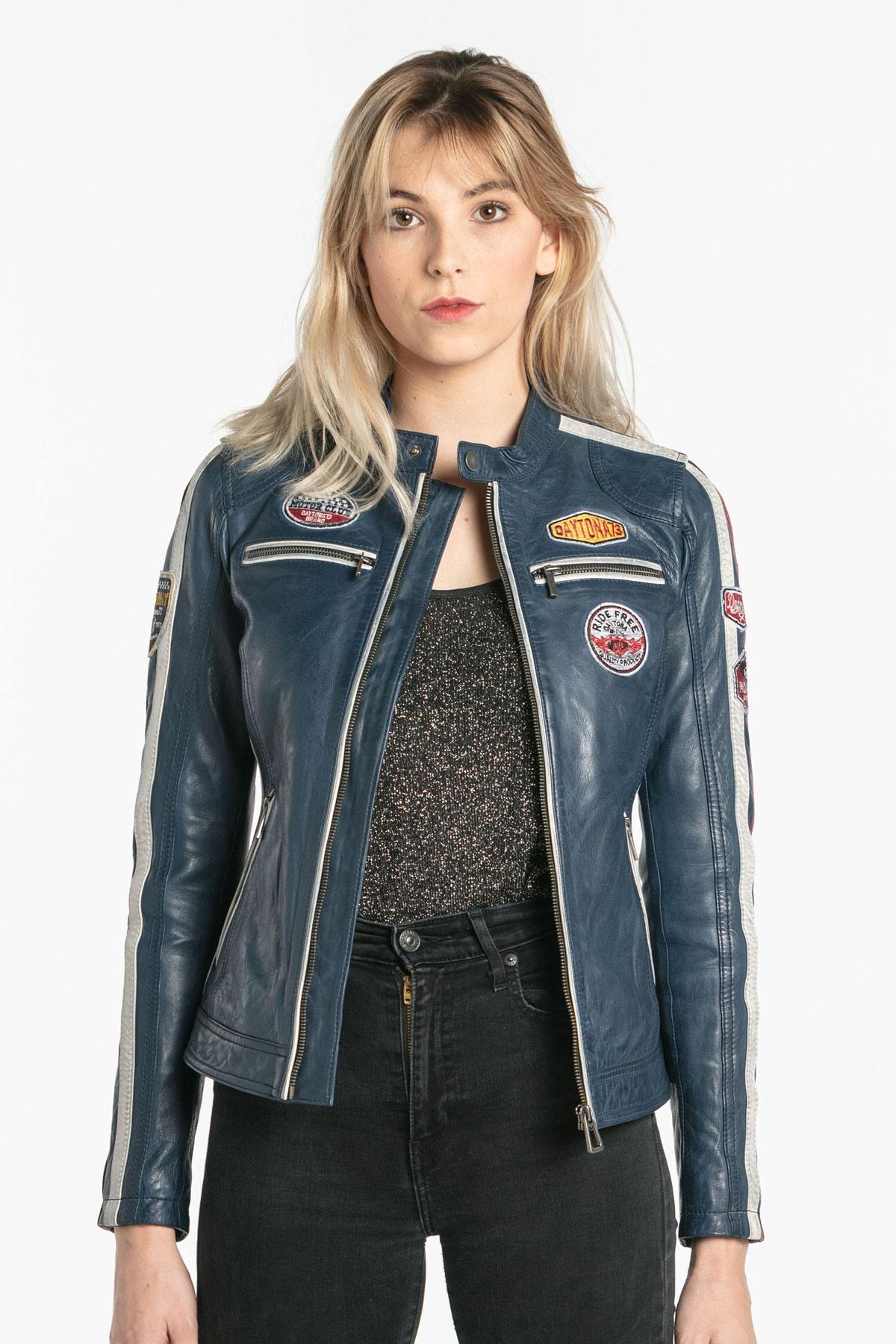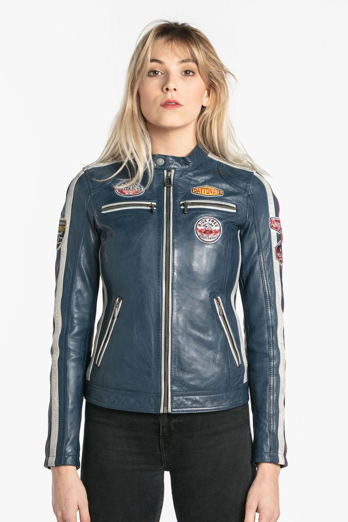 Tuotemerkki DAYTONA tarjoaa sinulle tyylikkään takin. biker-kauluksella, OLIVERA SHEEP ATLAS SHORT BLUE.
