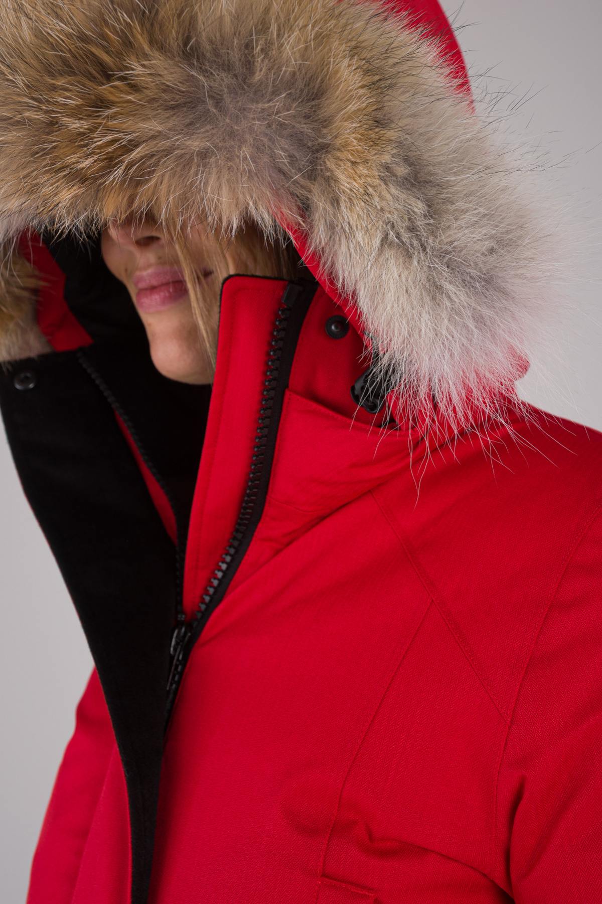 Kiinteä huppu, jota koristaa ylevä irrotettava kojootin turkki.