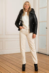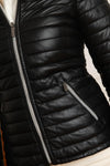 Hypermusta OAKWOOD 501 naisten takki. Tyylikäs musta tavallinen takki aidosta lampaannahasta. Musta tikattu "Down jacket" -tyylinen takki. Kaksi vetoketjullista sivutaskua ja valkoinen vetoketju edessä. Vaakasuorat saumat takissa, hihoissa ja hupussa. Pöyhkeä kaulus korostaa takin ainutlaatuista ja erottuvaa muotoilua. Musta kangasvuori, jossa pieni sisätasku. Tärkeä takki viileään ja tuuliseen säähän. Ihanteellinen ulkoiluun. Se on välttämätön vaatekaappi. Erittäin tyylikäs ja trendikäs, hypermusta väri tekee takista kiiltävän. sopii kaikkiin asuihin tyylikkään ja erottuvan ilmeen saamiseksi.