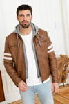 Tämä biker-takki hyötyy erinomaisesta lampaannahasta tehdystä rakenteesta, joka on valmistettu merkin kaikella tietotiedolla, jota edeltää sen maine. Olemme irrotettavan puuvillahupun fani, jonka avulla voit vaihdella tyylejä. Slimfit-leikkaus korostaa siluettia parhaassa valossaan. Mandarin-kaulus on painonapsainen. ja laskeutuu pohjassa olevaan keskussulkimiseen; postinumero. Rinta- ja alataskut ovat vetoketjullisia. Rakastamme olkapäiden ja selän sisäosia. vyötärön takana, mikä antaa vaatteelle luonnetta. Hihoja elävöittävät kontrastiset nauhat. Vuori on tikattu ja sisältää taskut.