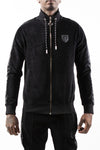 Tässä pitkähihaisessa mustassa puserossa on kaksinkertainen musta nahkaraita, joka on ommeltu molemmille puolille. Vyötärönauha, hihansuut ja korkea kaulus on resori, mikä takaa hyvän kestävyyden. Helpottaa avaamista ja sulkemista; Tämän collegepaidan taakse on ommeltu metallinen vetoketju. edessä. Merkkimerkki on päällystetty takana. vasemmassa rinnassa.