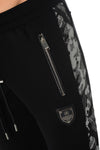 Nämä housut, joissa on 70 % puuvillaa ja 30 % polyesteria, ovat mustaa kontrastia. nauhalla, jonka kummassakin jalassa on painettu hopea.