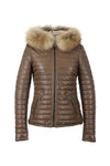 Light brown down jacket in leather and fur collar - Image n°1