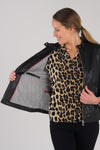Sen musta väri, materiaali ja suora leikkaus ovat ihanteellisia seuraamaan sinua rennosti ja tyylikkäästi. Vahvista tyyliäsi housuissa tai hameessa viimeistelemällä tällä takilla. Biker-tyylin fanit valitsevat yhteensopivat nahkahousut tai minihameen.